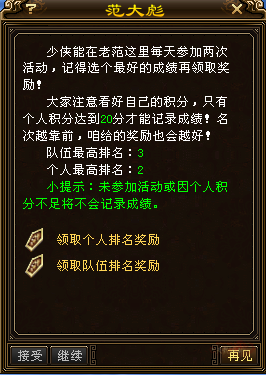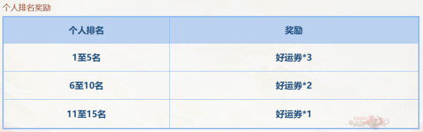 个人积分达到10分,就可在比赛结束后领取队伍排名奖励和个人排名奖励。