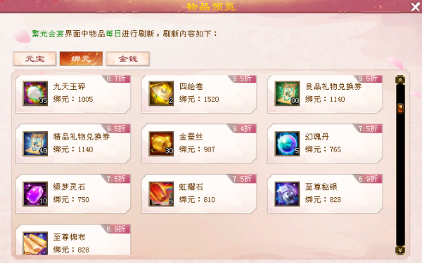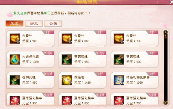 可以购买的折扣物品分三个商店:元宝、绑元、金钱