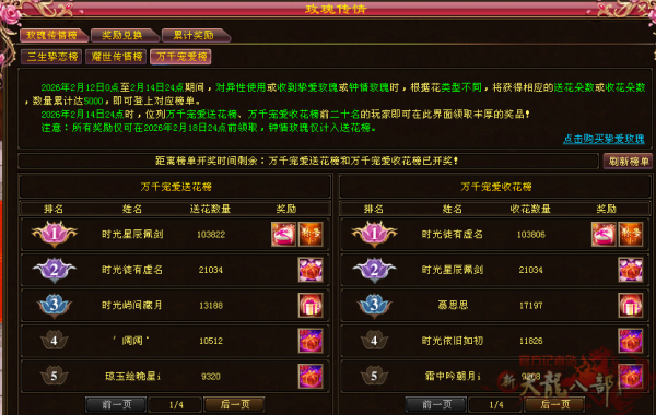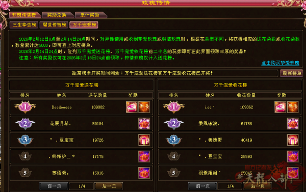 这也是榜一与榜二、三差距比较大的一个榜单,同时收花榜一远远高于送花榜一,看来大多数玩家比较偏爱苍雪领主坐骑。