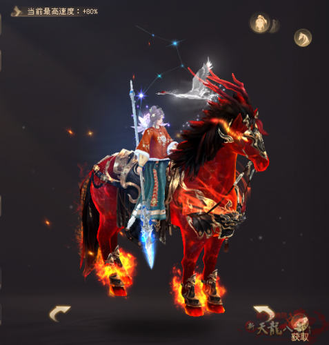 通体赤红的神驹昂首扬蹄,每一步都踏碎风的桎梏,+80%的移速让玩家如离弦之箭,在天龙的江湖里驰骋纵横。