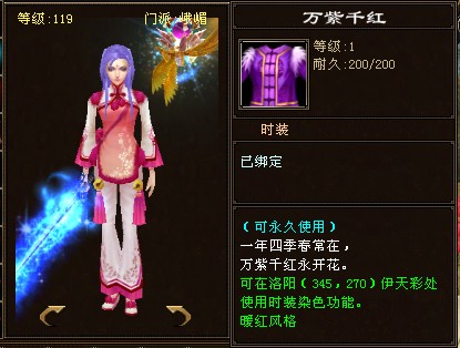 在春暖花开的春季,把衣橱里面的衣服也晒一晒吧。天龙八部3的美术们,突然发现该让“时装:万紫千红”出来美一美秀一秀了。而闪着神秘的虹曜石似乎是“万紫千红”此刻最华美的色彩。可以染色的“万紫千红”, 裹着曼妙甜美的染色好似蜜糖,瞬间俘获天龙3女玩家的芳心。让霓裳作为麻豆,演绎一下染色后的“时装:万紫千红”。