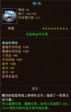 属性条还不错 数值应该不是最高 玉女心经寄售那有个70属性的45戒指