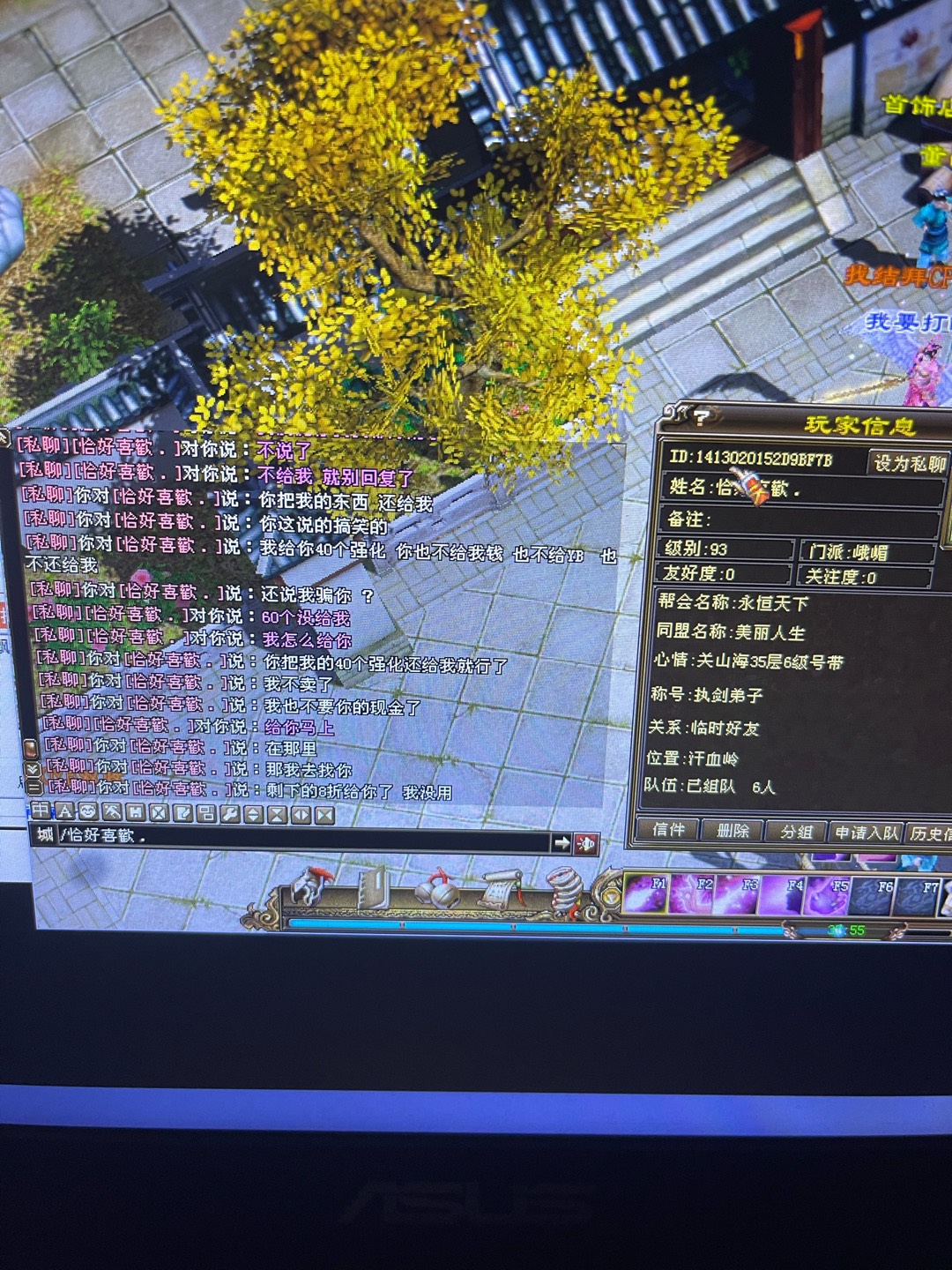 帮会:永恒天下 门派:女峨眉 等级:93 自称是妹子,有6级号带观山海,正在直播,让我帮他买100个至尊强化,然后支付宝转账给我,我不知道强化好不好卖,我买好了之后一直催,我脑子一抽,交易了,结果就是这样一副嘴 ...