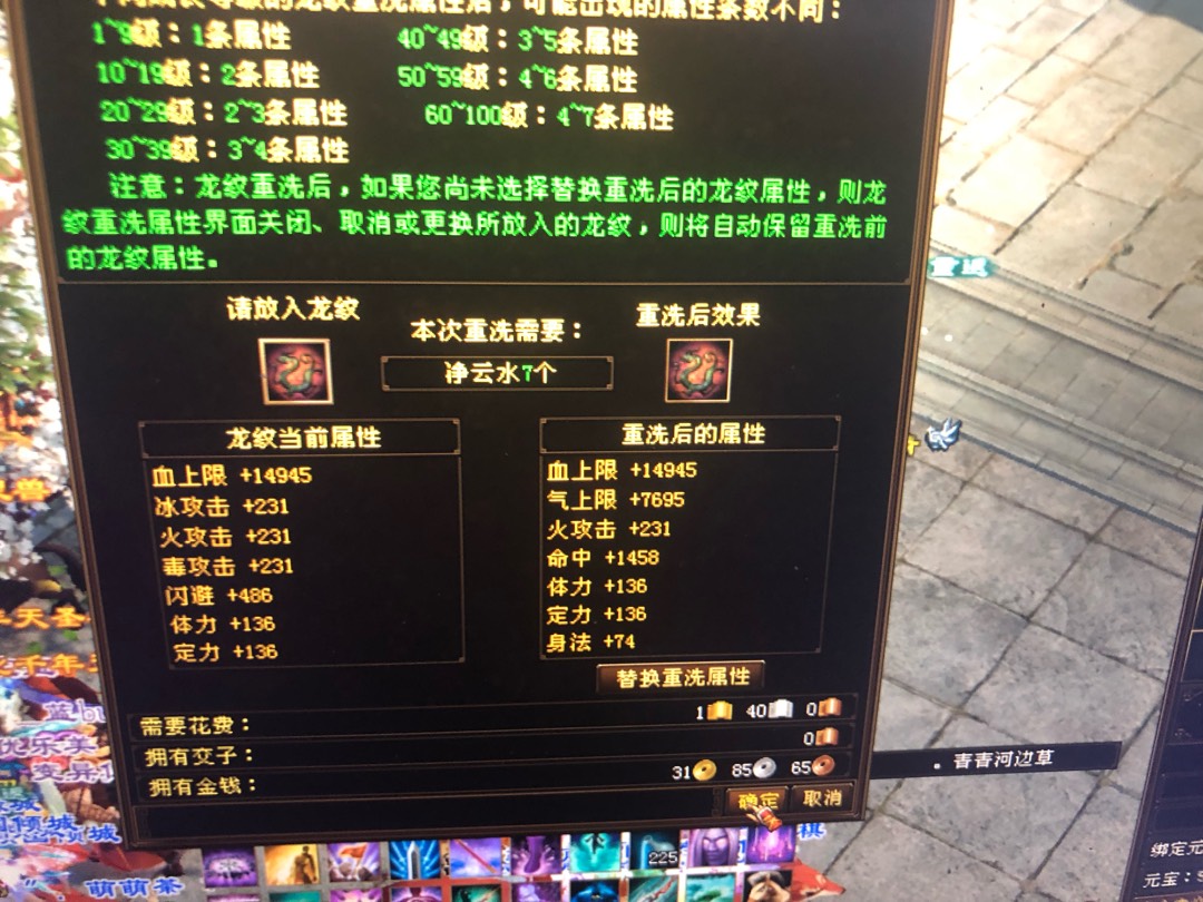 龙纹最坑爹,我慕容洗了1800块洗的还是垃圾,我天山也洗了2000块,实在是洗不出,就八星扔了,买了个人家洗好的在升级,