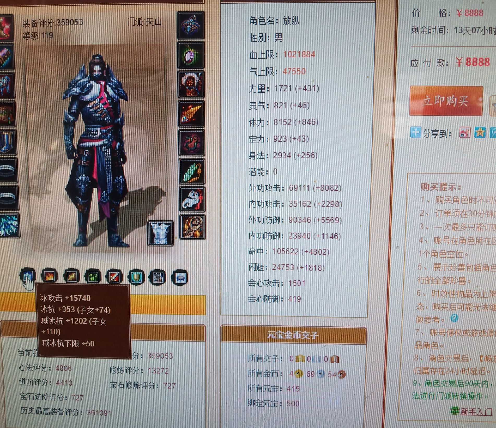 真元差三个金,血量一般,减抗低,卖8888,买回去哭死。立即亏3000有没有。