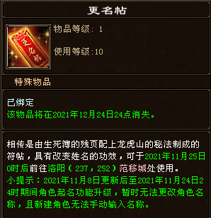 还有小伙伴不知道免费的更名帖去哪里领吗? 洛阳改名的NPC范移城【238,253】处领取,过期不候 需要注意的是,这是一张有限时间的更名帖 领完需等到11月25号0点后才可以使用,有限期一个月 ...