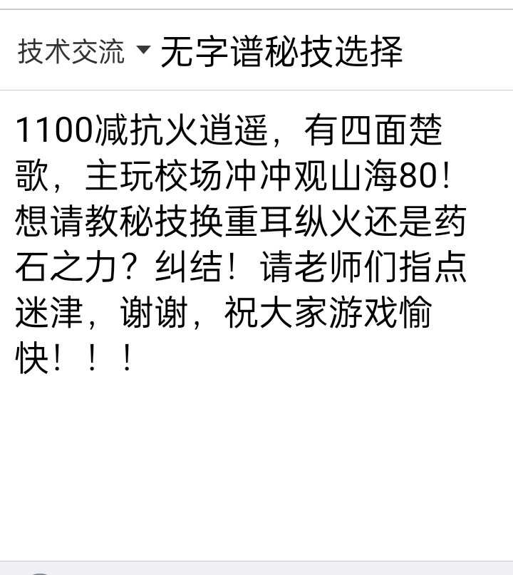 1100减抗火逍遥,有**面楚歌,主玩校场冲冲观山海80!想问下秘技换重耳纵火还是药石之力?请老师们指点迷津!谢谢