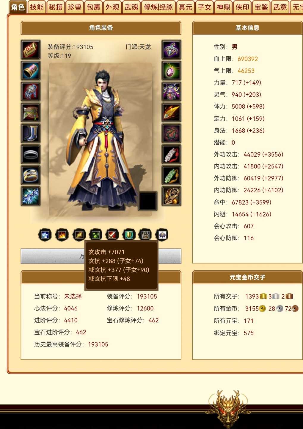 静宇 发表于 2022-3-11 10:50 天龙,玄功7000多,其他三属性都是1000左右。逍遥,火攻7000多。本人常打副本、boss、主生活玩家,很少打架 ...