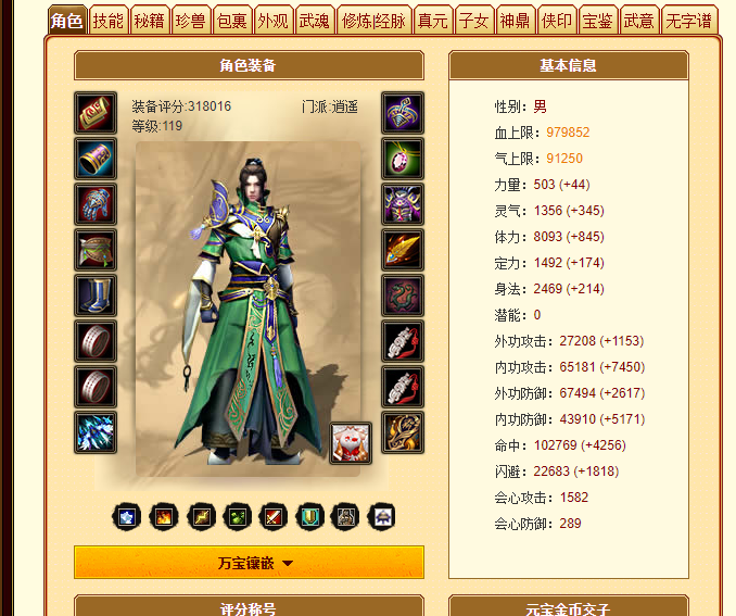 | 先不说青眼有加这个技能,从会心来看,图一的号接近1600会心,就说明伤魂、投壶、遣美、高门等全系列无字谱搞好了。楼主号的会心才1200,至少说明投壶、高门、遣美等蓝色无字谱好多没搞。不是说只搞自身对应的属性无字谱就行的,其他属性的无字谱都要搞,因为可以收集属性!等楼主搞完投壶、遣美、高门等全系列蓝色无字谱,命中、会心肯定提升一大截!现在不是以身法论命中、会心了,无字谱出来,绝大部分玩家都改为体力点了。 |