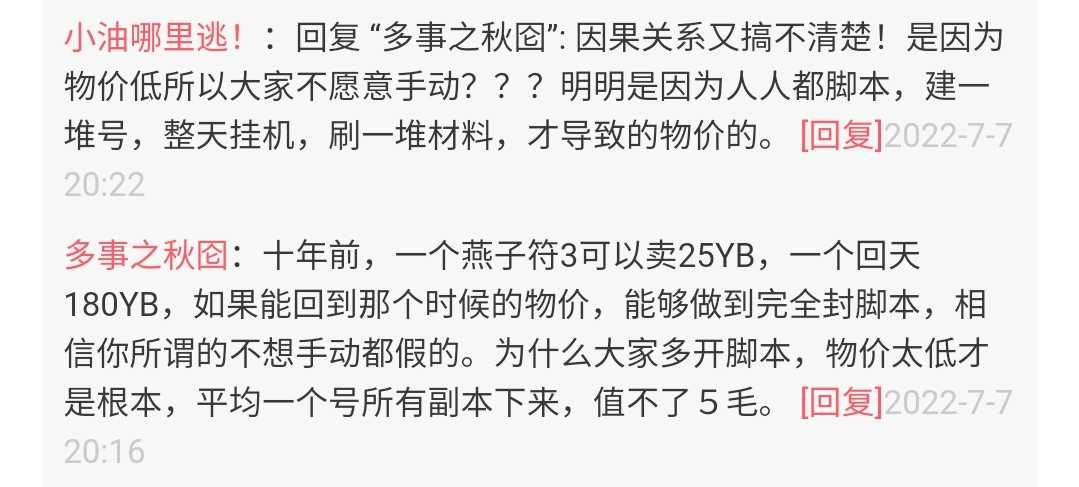 | 你说的物价是这个理,但是还有其他问题,就好比物价太贵,活动给的东西就一样不会太多,这样就会出现刚开怀旧的那样,你冲千把块,刷三环都费劲,现在天龙养成的东西太多了,这样的话估计新区就没人了,老区的话直接禁止多开脚本啥的,会有大量号上架,号大量贬值,这样老区新区都凉了……所以官方才不敢轻易动,说真的现在天龙进阶号估计和玩家数量都差不多了 |