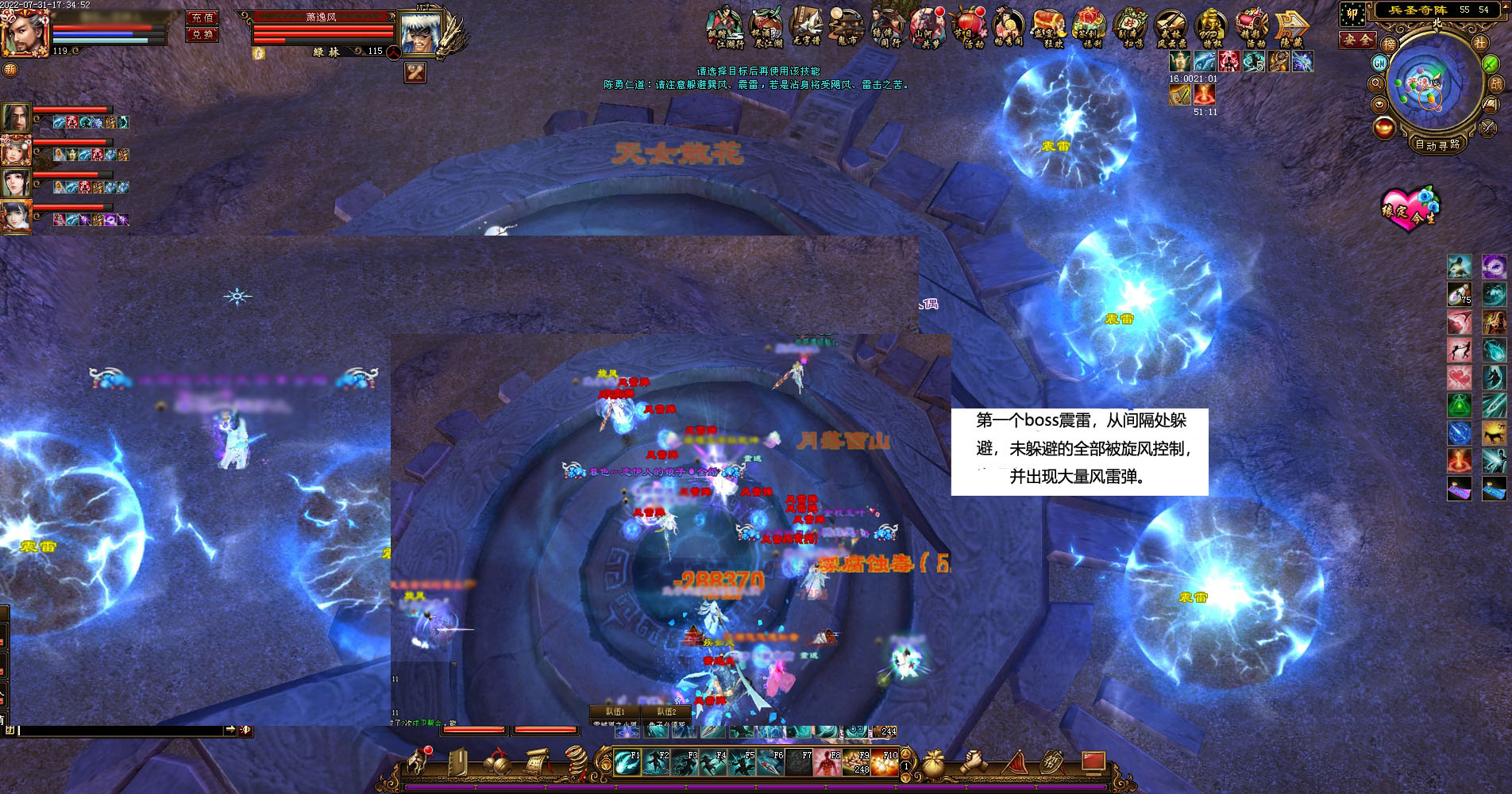 手动双开:天山、桃花60W血,1W属性(团队属性大概也是1W属性左右,大家都是60W血)。总共大概打了20分钟。 1、boss1、躲避震雷
