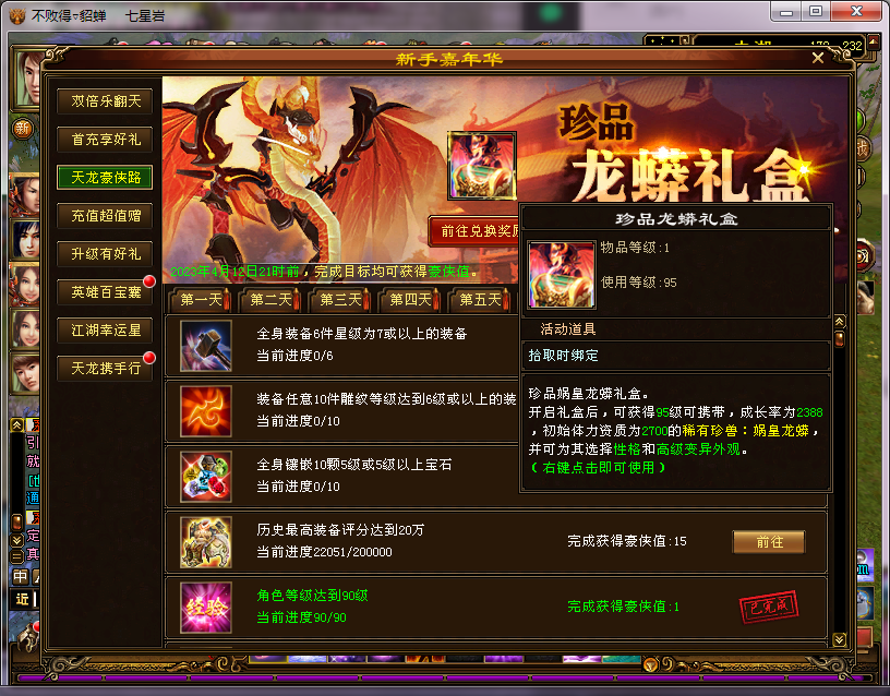 准备5000个精晶石,全套8星装备,500个强化露,1000个强化精,12个橙色真元,100万元宝 |