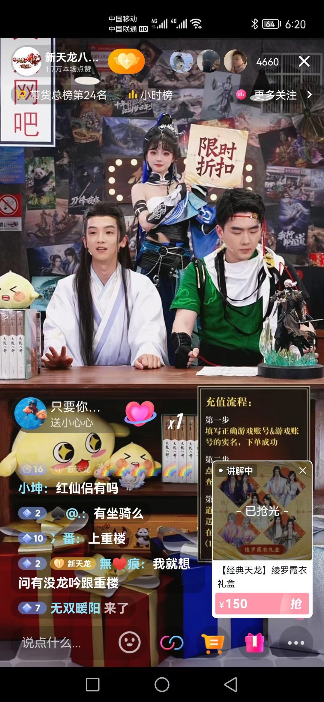本帖最后由 芊✘芊 于 2023-5-8 18:23 编辑 天龙八部经典场 抖音直播间正在进行中 少侠抢礼盒了吗