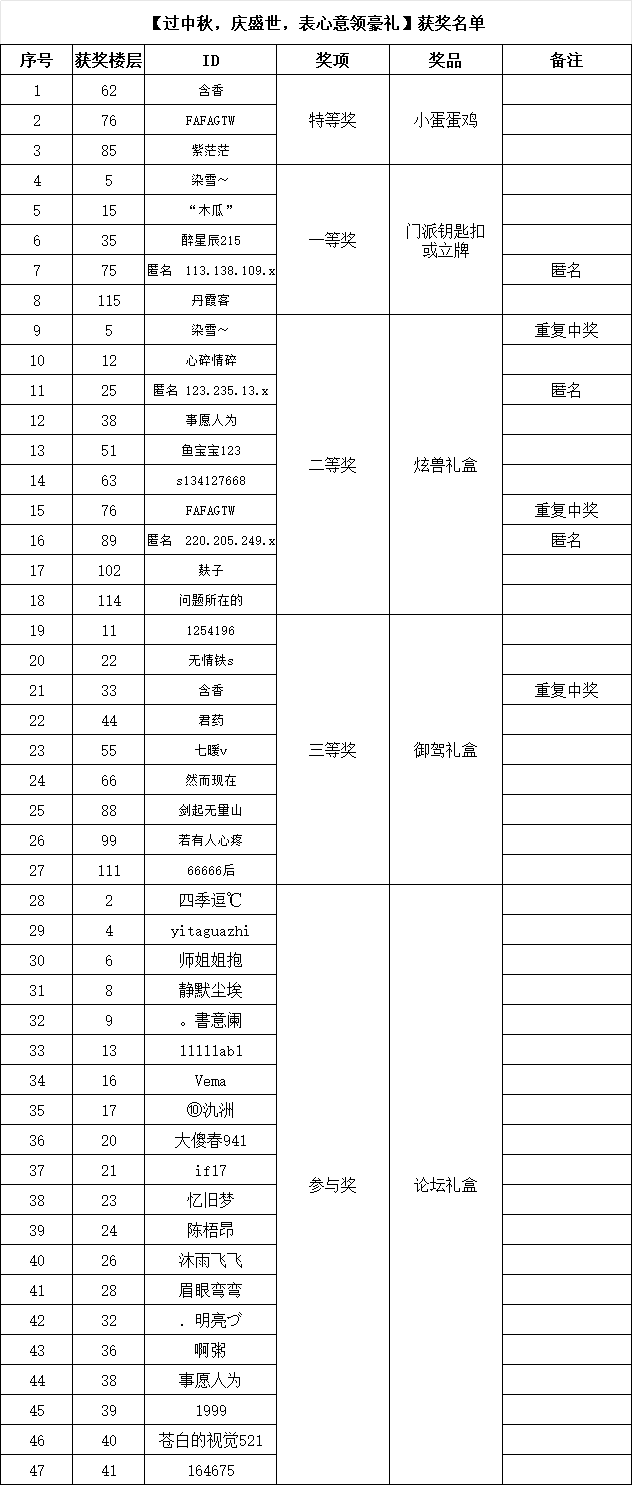本帖最后由 芊✘芊 于 2023-10-9 08:07 编辑 中秋国庆小伙伴过的可开心? 感谢各位参与活动 恭喜以下中奖小伙伴 获得周边的小伙伴请10月13号前私密或者回复联系方式 获得礼盒小伙伴请耐心等待,并关注私信 会私发 ...