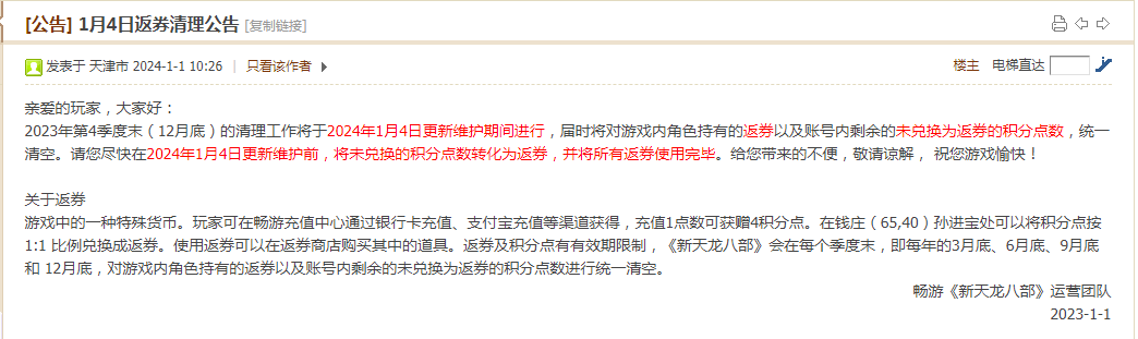 按照以往清完返券就该名动了 有“知情人士”透露8号要更新名动(如果不是别揍我) 想问今年年终还有时装吗,有的话大家趁机刷刷消费啥的 紧接着就该出活动了吧,金蚕丝强化什么的,再紧接着就到情人节花榜 这口 ...
