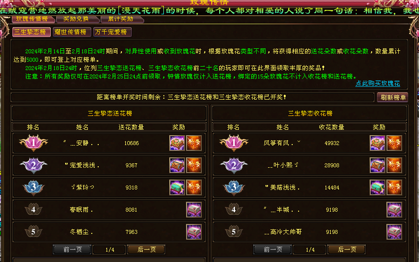 这是天命区的珍兽榜最终榜单 送花跟收花严重失调了 应该很多是收花返yb的那种 今年花榜还延长了时间 大家越来越内卷啦! 一起期待一下23号坐骑榜会卷成什么样吧 ...