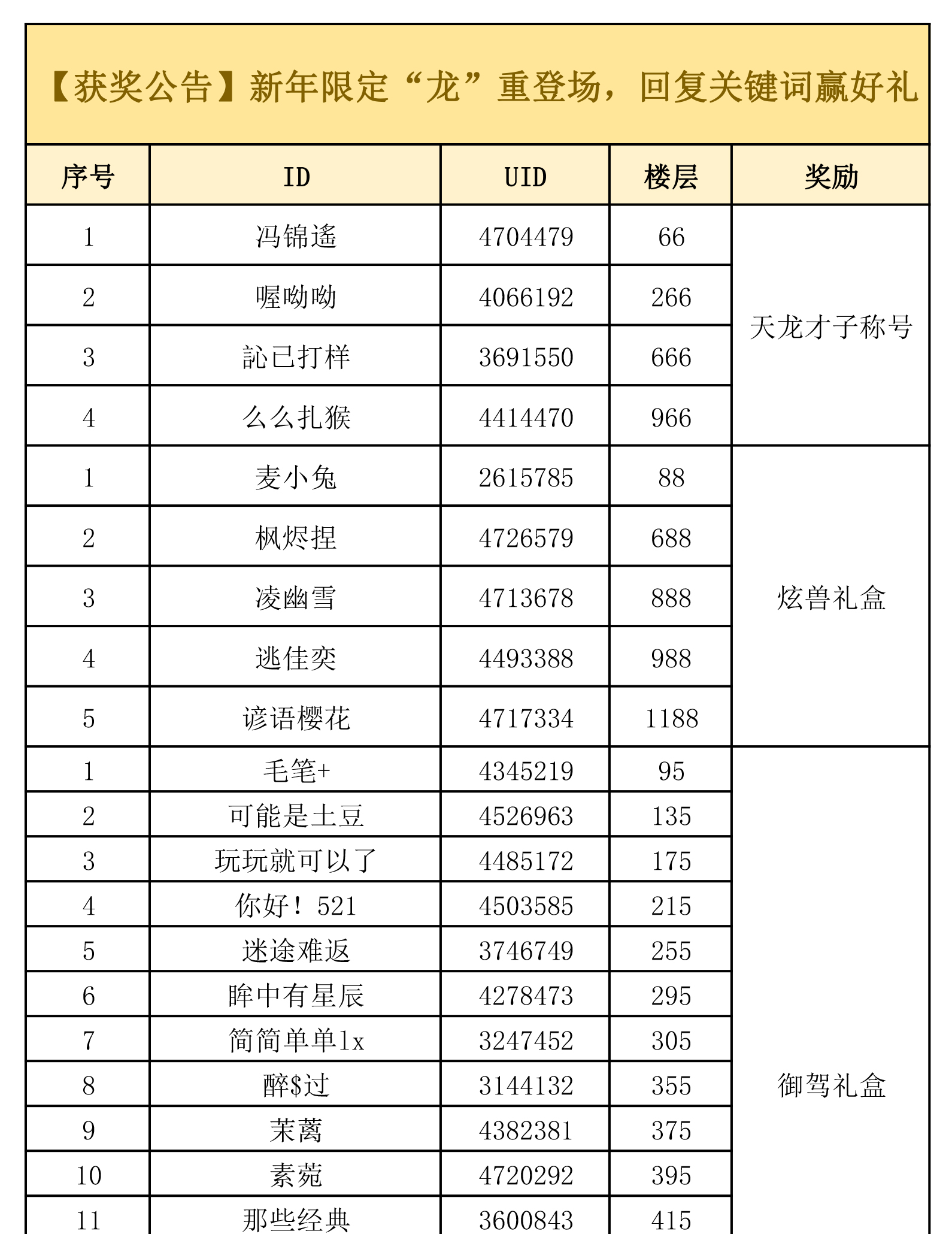 【活动】新年限定“龙”重登场,回复关键词赢好礼 已结束,感谢大家参与! 现公布获奖名单 恭喜以上获奖玩家 礼盒兑换码将在15个工作日发放完毕 请注意查看自己的私信及时到大理龚彩云处兑换 因数量较多,未收到 ...
