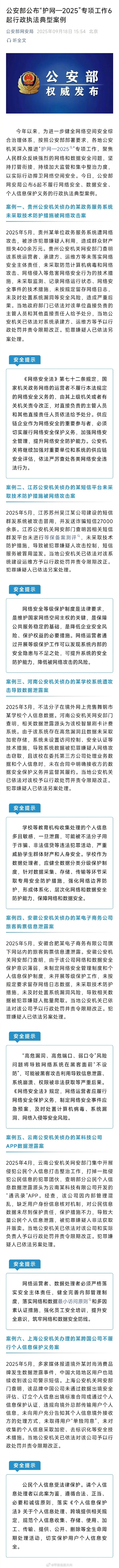 【#公安部公布6起行政执法典型案例#】#护网公安部公布6起行政执法典型案例# 今年以来,为进一步健全网络空间安全综合治理体系,按照公安部部署要求,各地公安机关深入推进“护网—2025”专项工作,聚焦人民群众反映 ...