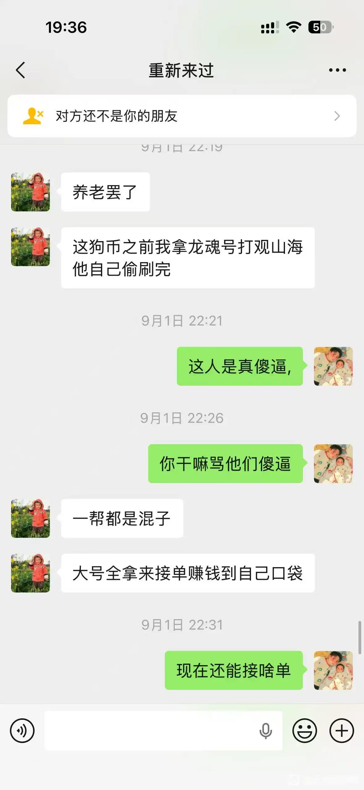 柴舔松,ID南行,现任不忘初心鱼腩帮帮主(因帮里确实没活人)。长期依靠跪舔帮里的号拿去接单观山海,此人过于自私的游戏习惯导致帮众残魂对其非常不满,时常在微信私聊中骂骂咧咧。顺口提一下南行的口头禅,让你去 ...