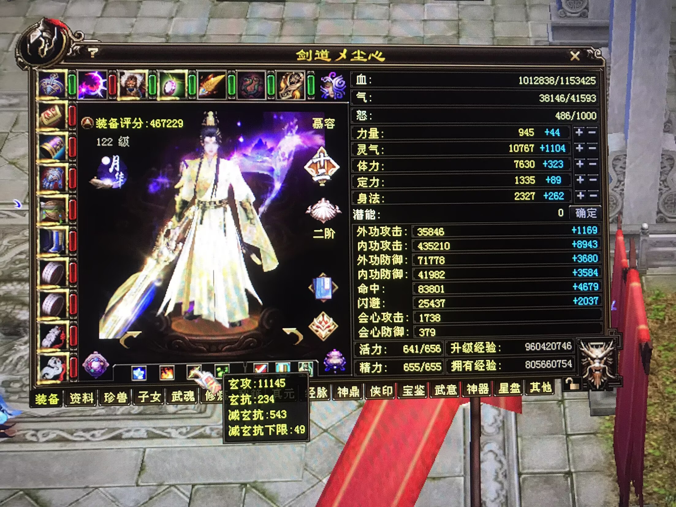 | 和我唐门差不多,110万血,1.8主,副属性有1万多点(三巾帼),灵气吃药有9千多点。满状态28万内 |