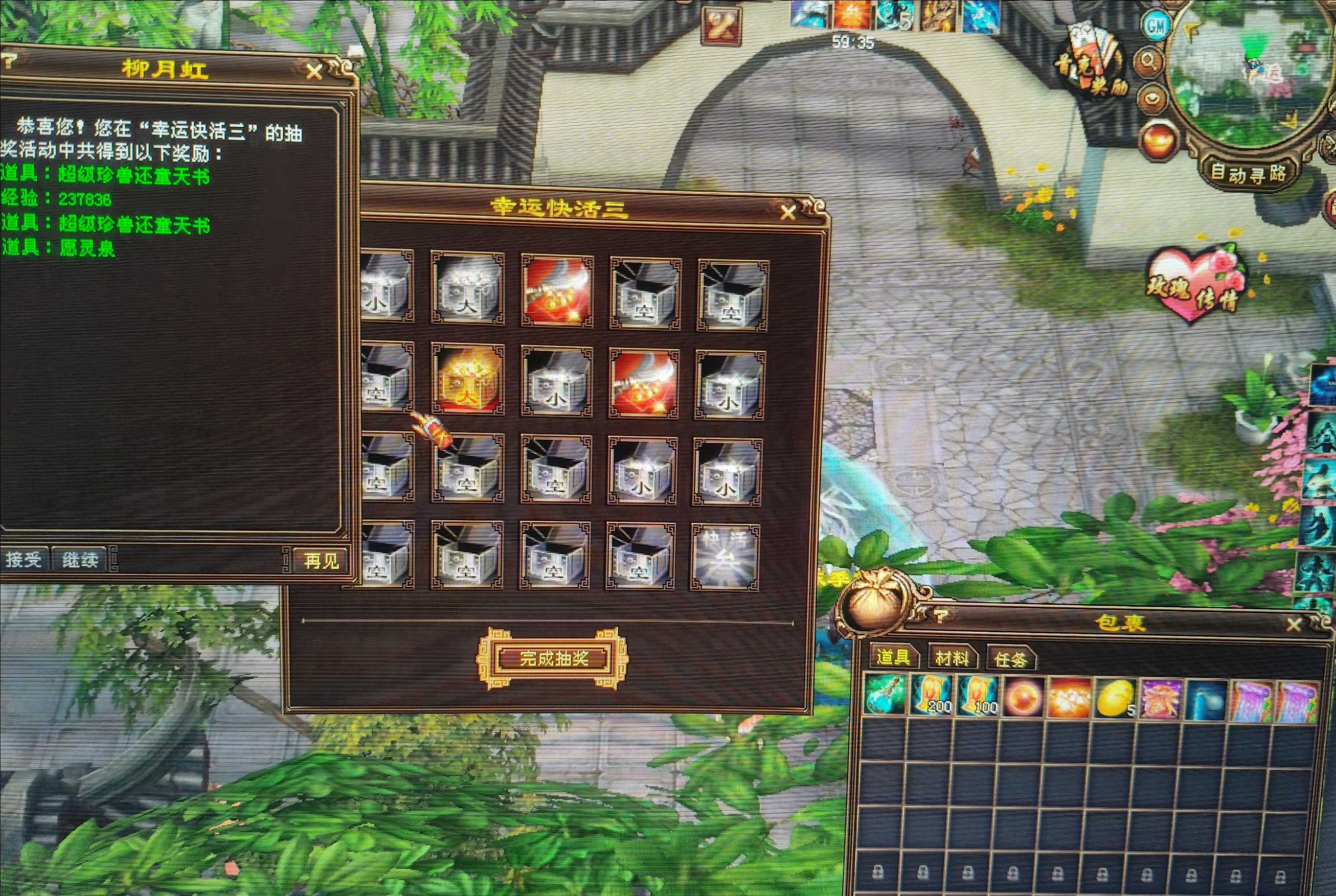 玩天龙18年,第一次幸运快活三,一个号抽两个超级还童天书,另一个号抽到一个,都是同时抽到的